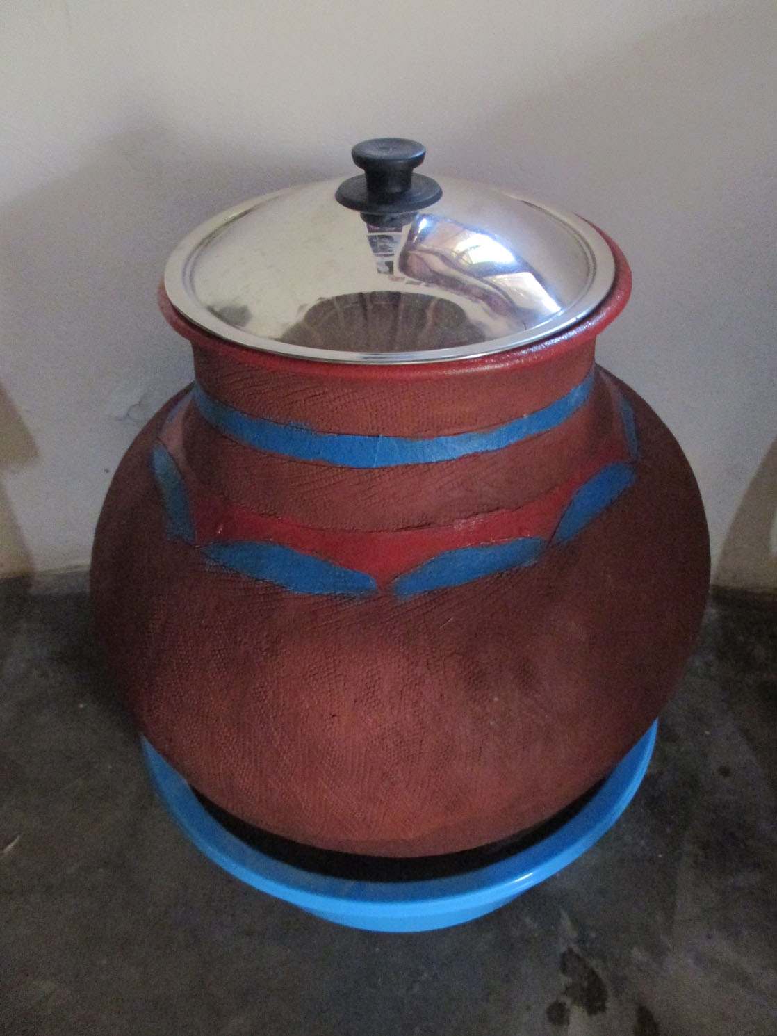 Today we bought two large clay pots. One to keep water cool (which is what most locals use); and the other to try and keep some small items a little cooler (such as UHT milk, juice and a few vegetables). We have filled one ¾ with water and inserted a small plastic container with items inside, and covered with a lid. We are told by locals that the post will leak for a couple of weeks since they are new but we await to see how it all works… fridge_1B Inside_fridge