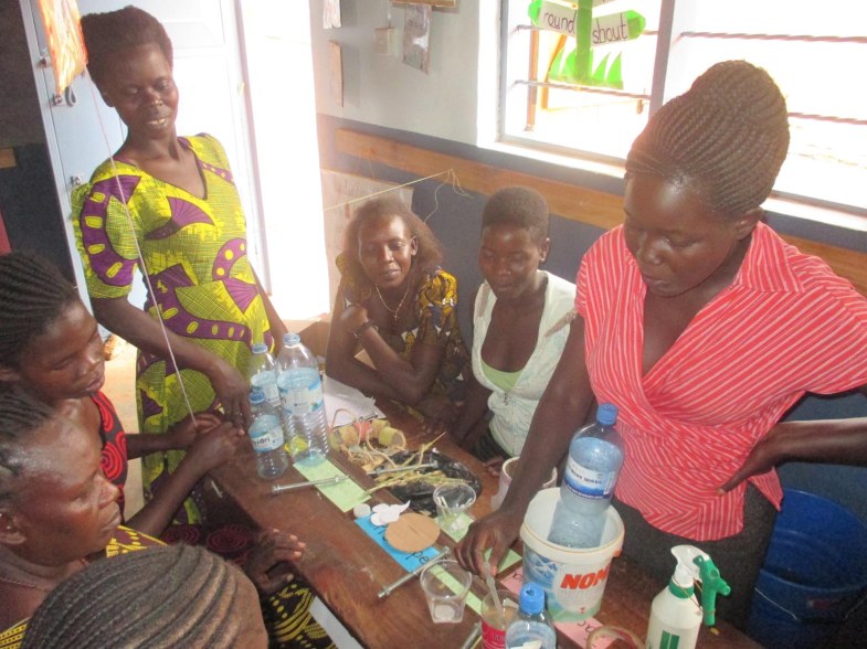 Teacher Catherine demonstrating using local resources to develop fine gross motor skills.