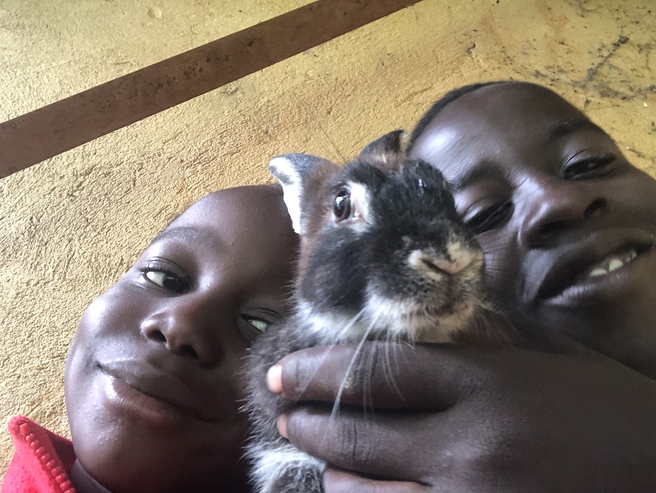 But he doesn’t have the responsibility alone, the frontline carer for these rabbits and guinea pigs is Myron’s friend Odong who lives behind us. Each morning Odong walks around our village picking food from neighbouring properties. He then comes over to feed them. Myron joins him of course, mostly dancing around (literally), possibly doing a little play fighting, gymnastics and generally keeping Odong company. When they clean out the rabbit cage, it’s the same deal: Myron ‘helping’ Odong, mostly with his company and conversation, and our constant encouragement beckoning from the door.